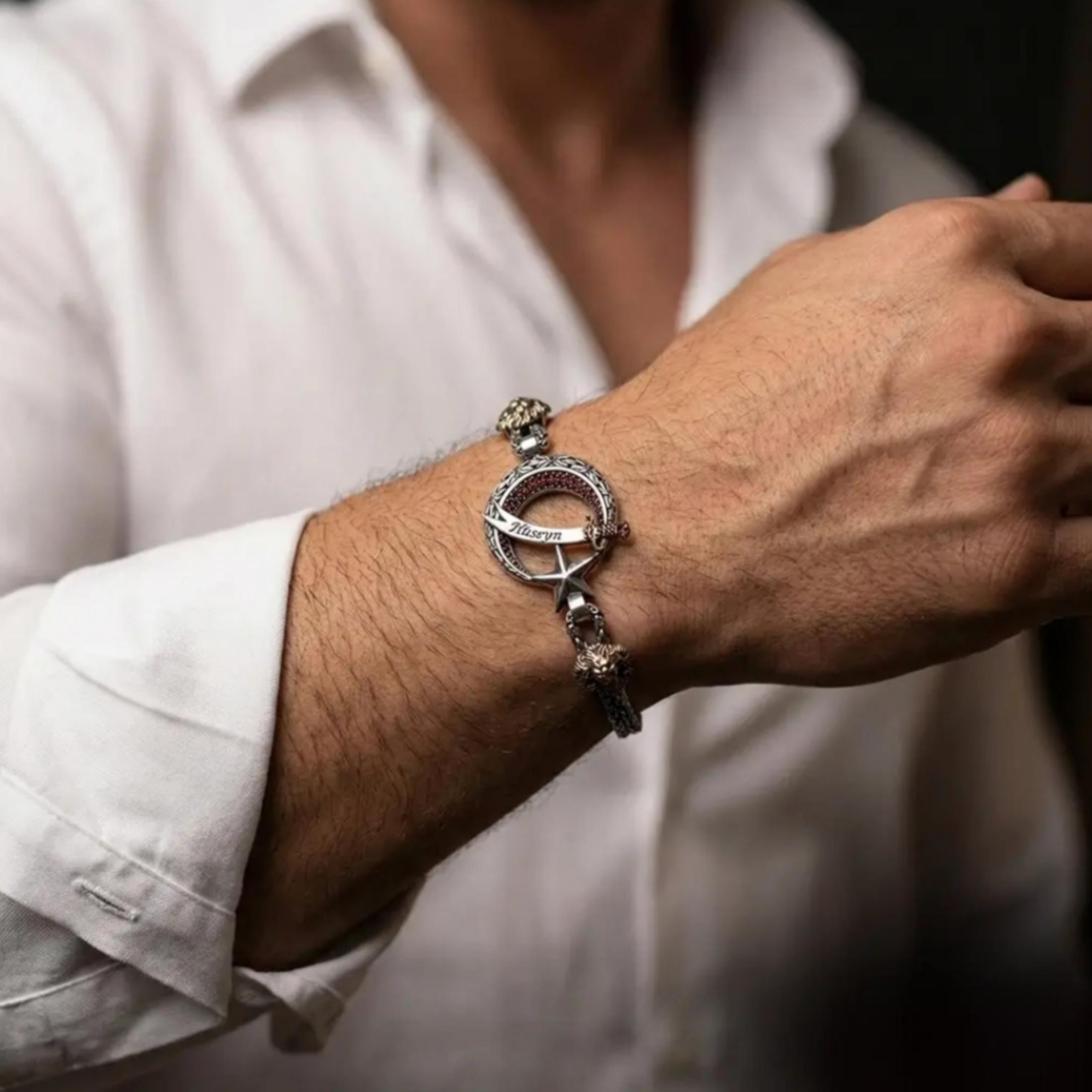 At the center of the design, the crescent moon and star meet a sword, representing strength, honor, and courage. This bracelet is not just jewelry