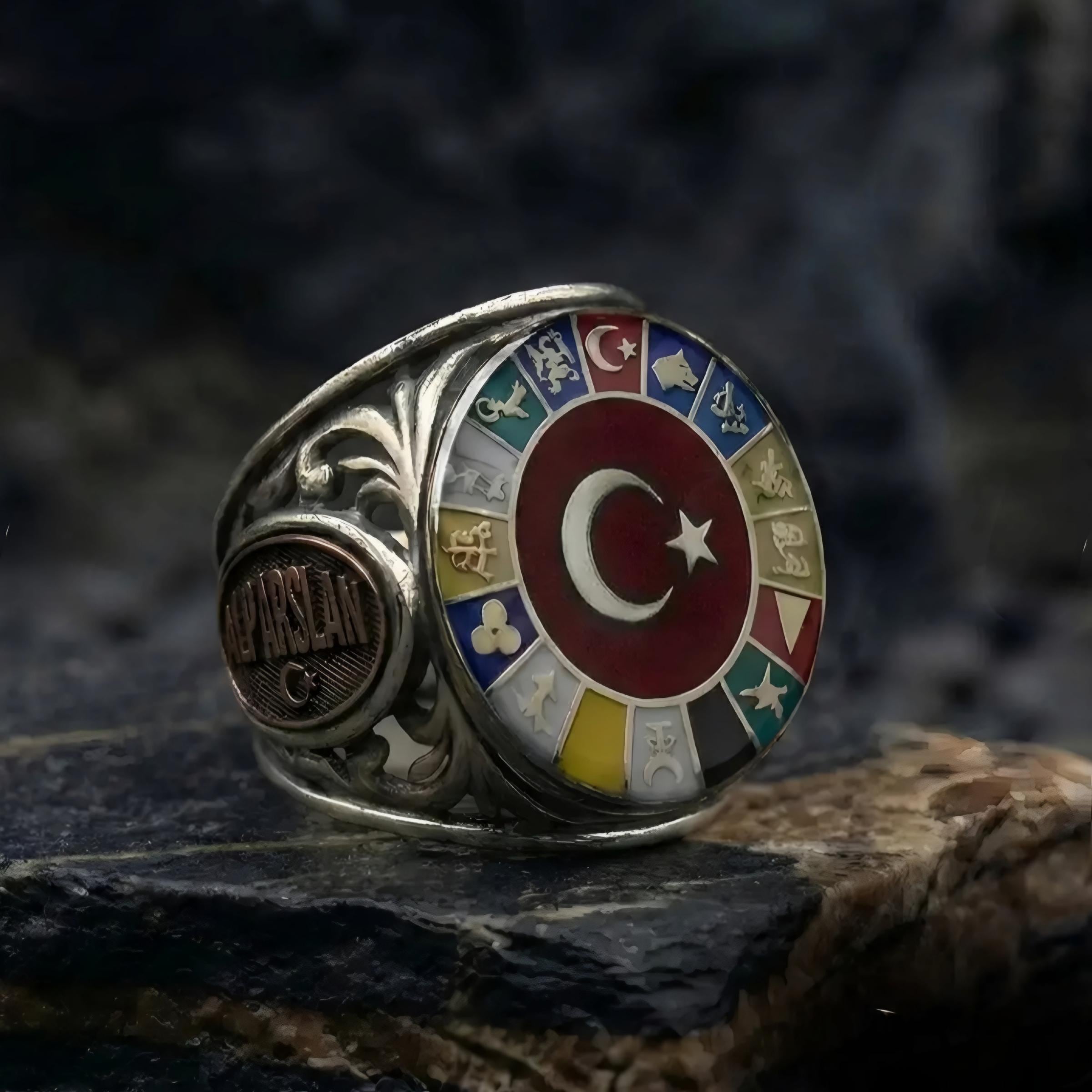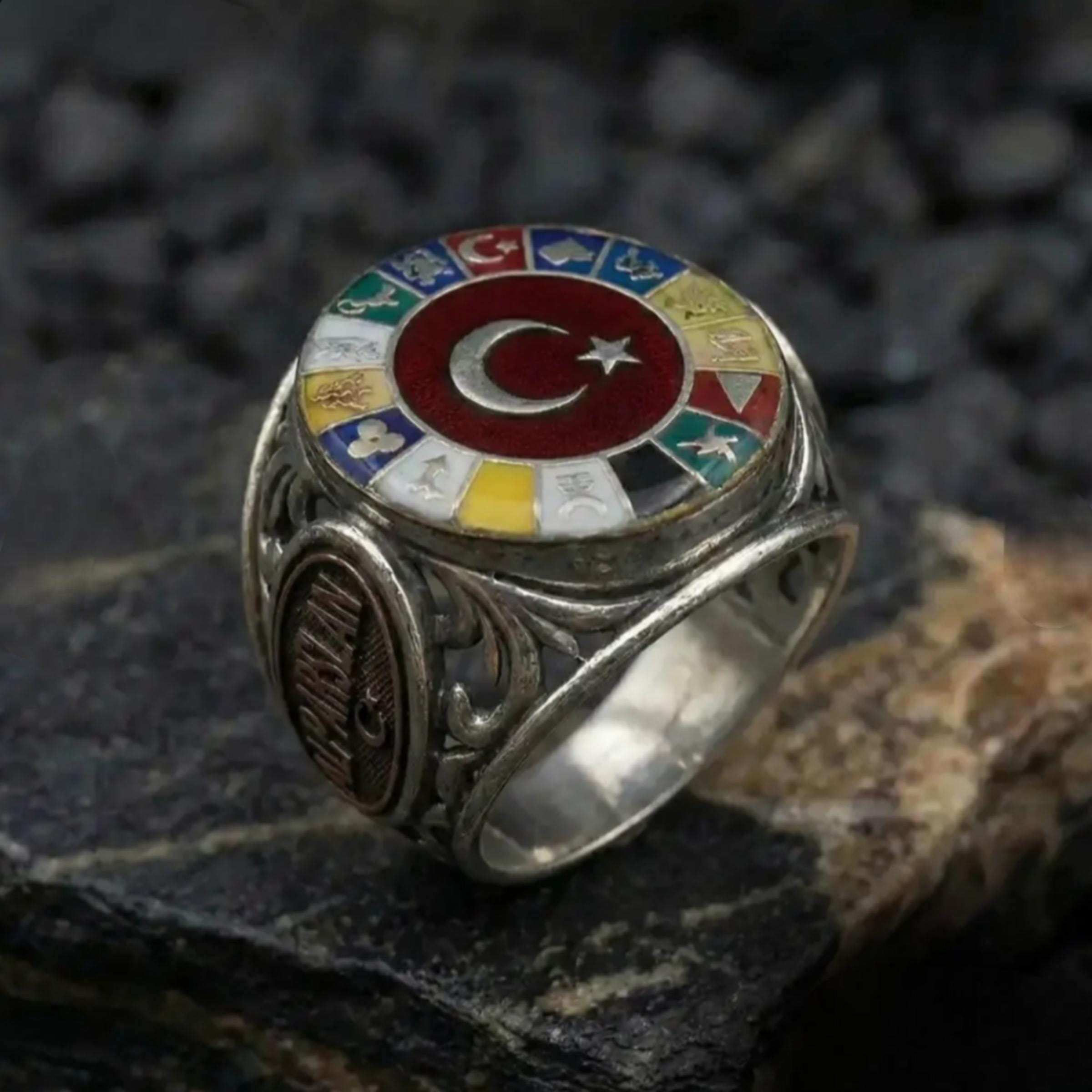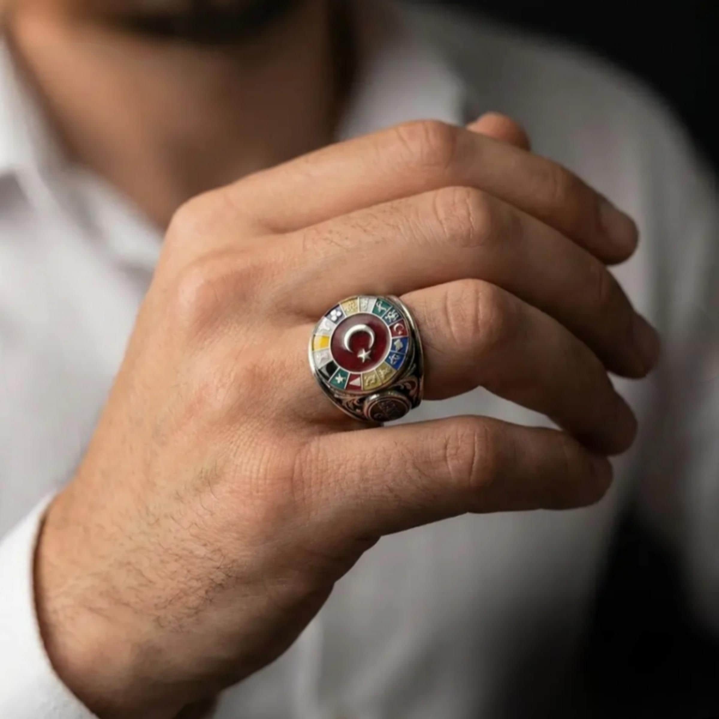 While the crescent and star motif in the center is a strong symbol of nobility and belonging; The symbols of the 16 Turkish States surrounding it make this ring not an ordinary accessory.
