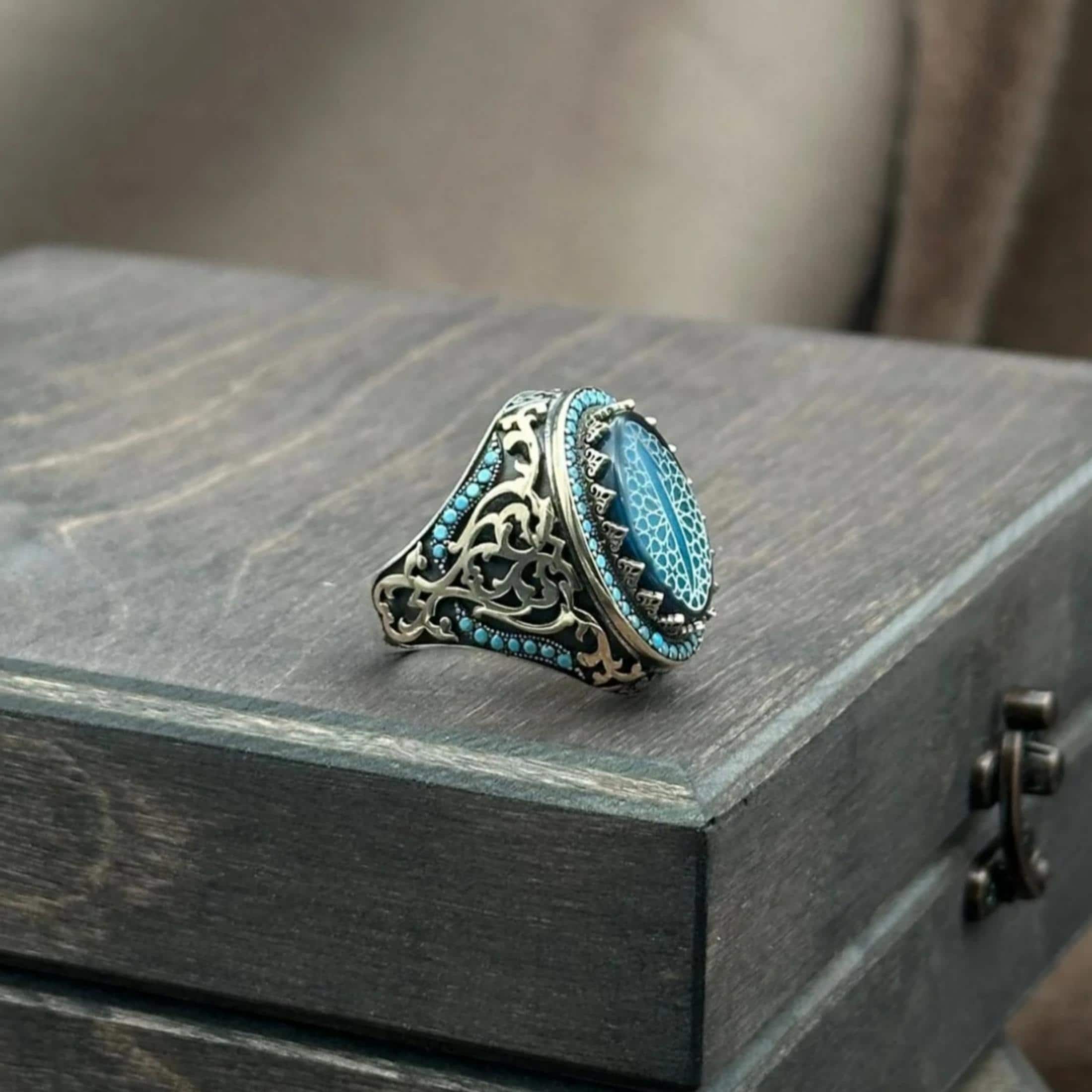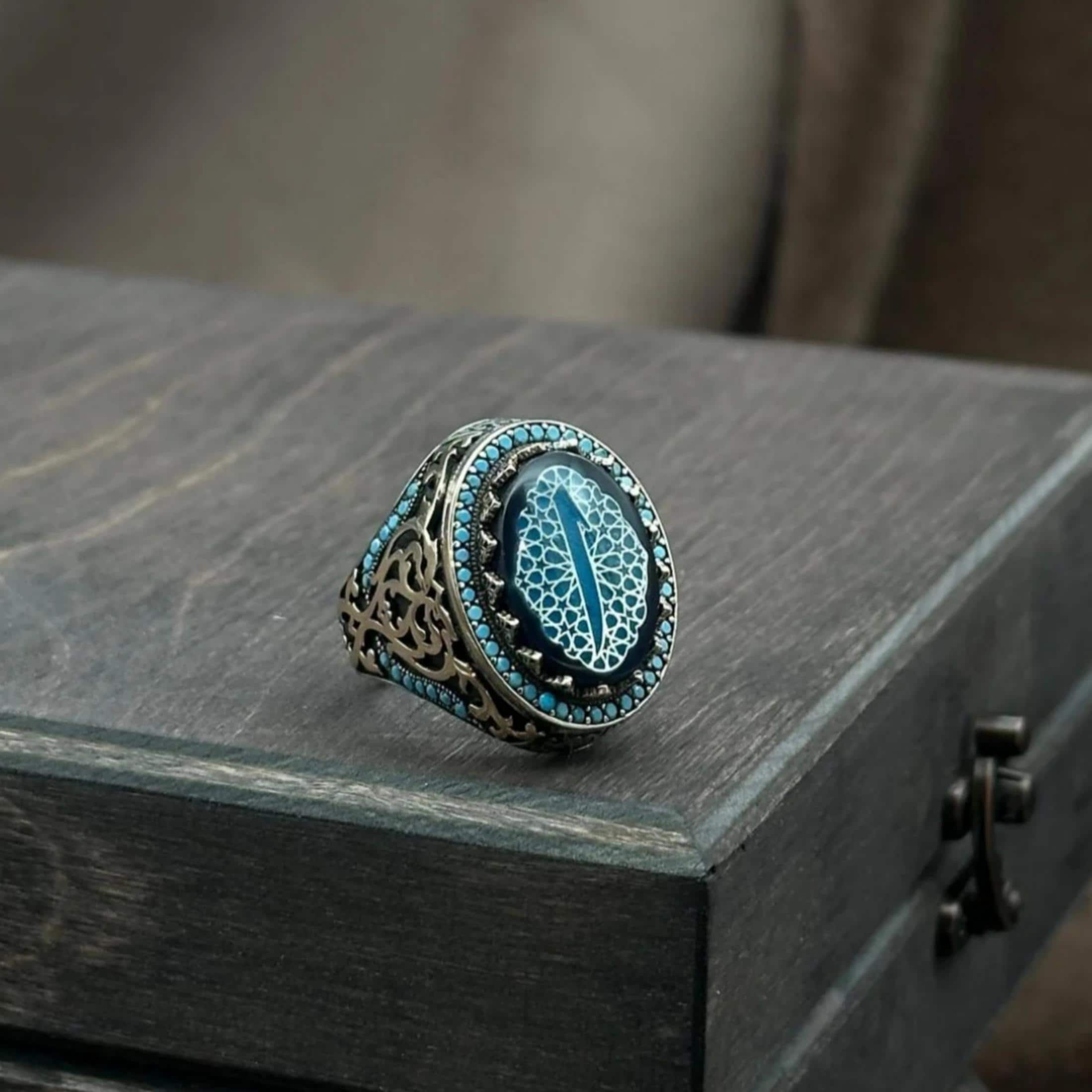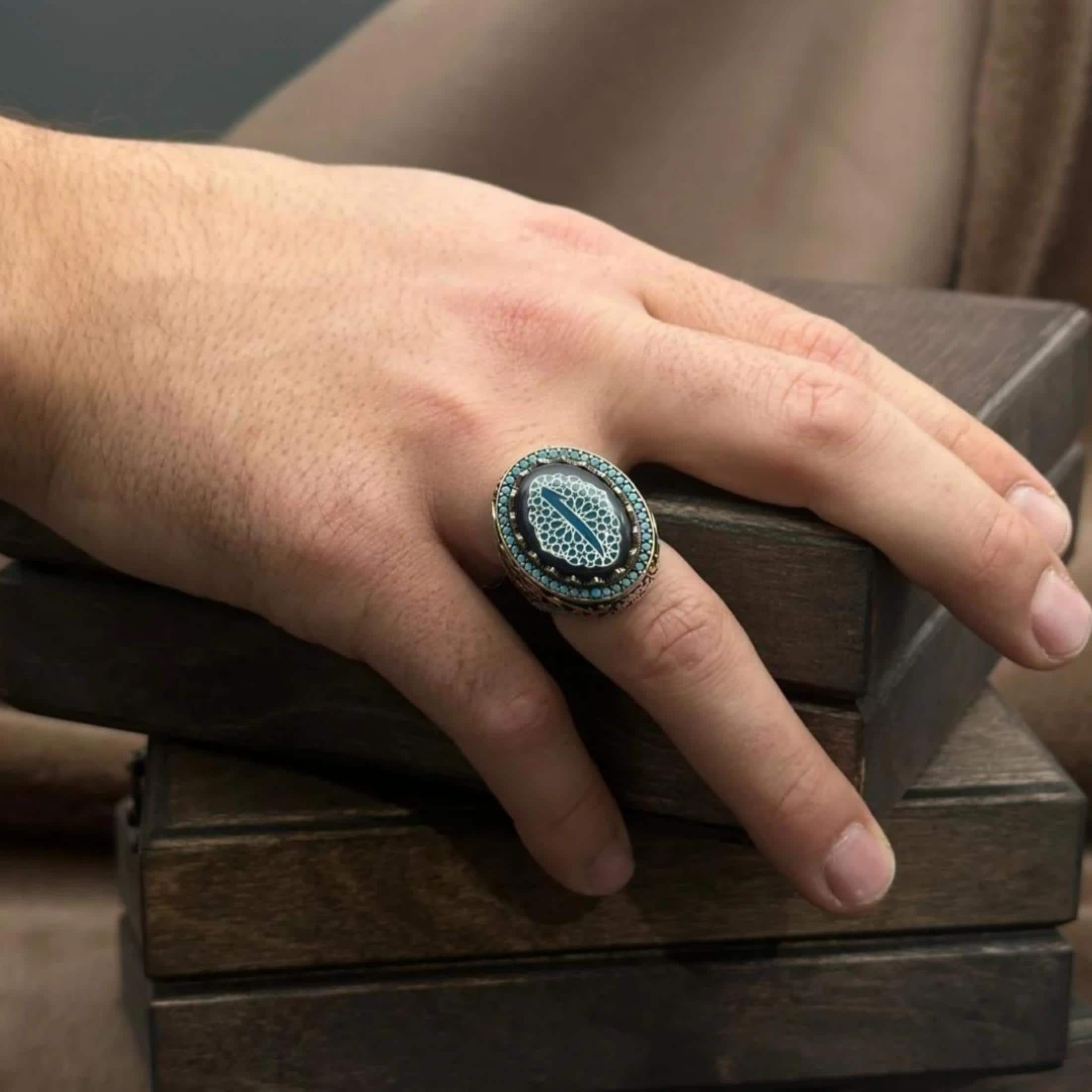 The Elif symbol in the center of the ring represents power, nobility and deep meaning in simplicity. The subtle Seljuk patterns surrounding it and the impressive turquoise stone details on the side surfaces transform this ring from an ordinary accessory into a powerful piece of character.