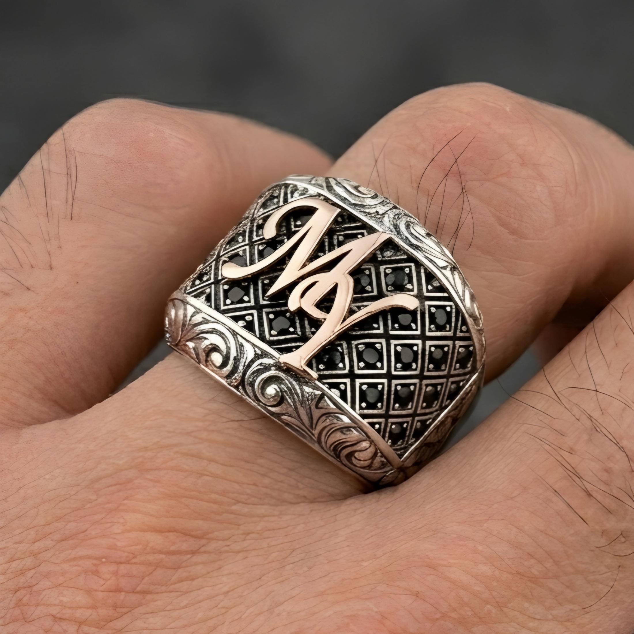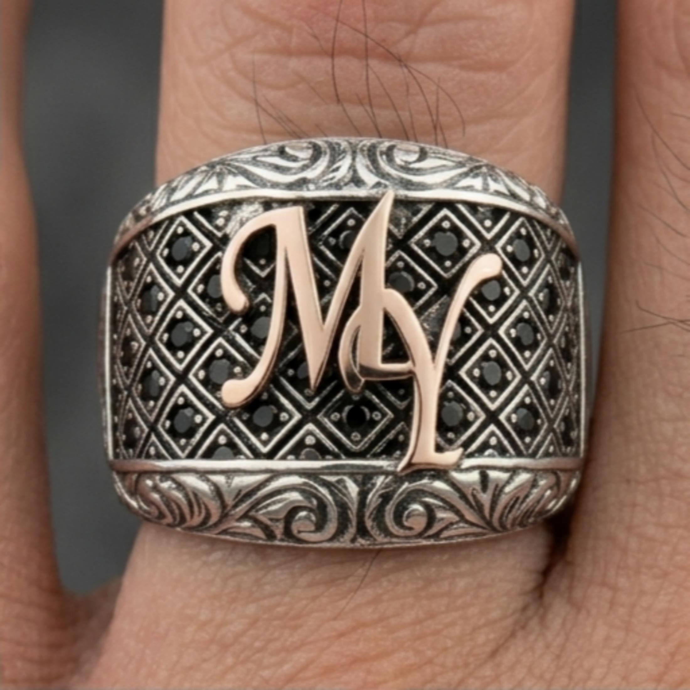 The rose-toned letter adds a modern and eye-catching character, while the stone-covered surface and engraved side details make the ring even more powerful and distinctive.