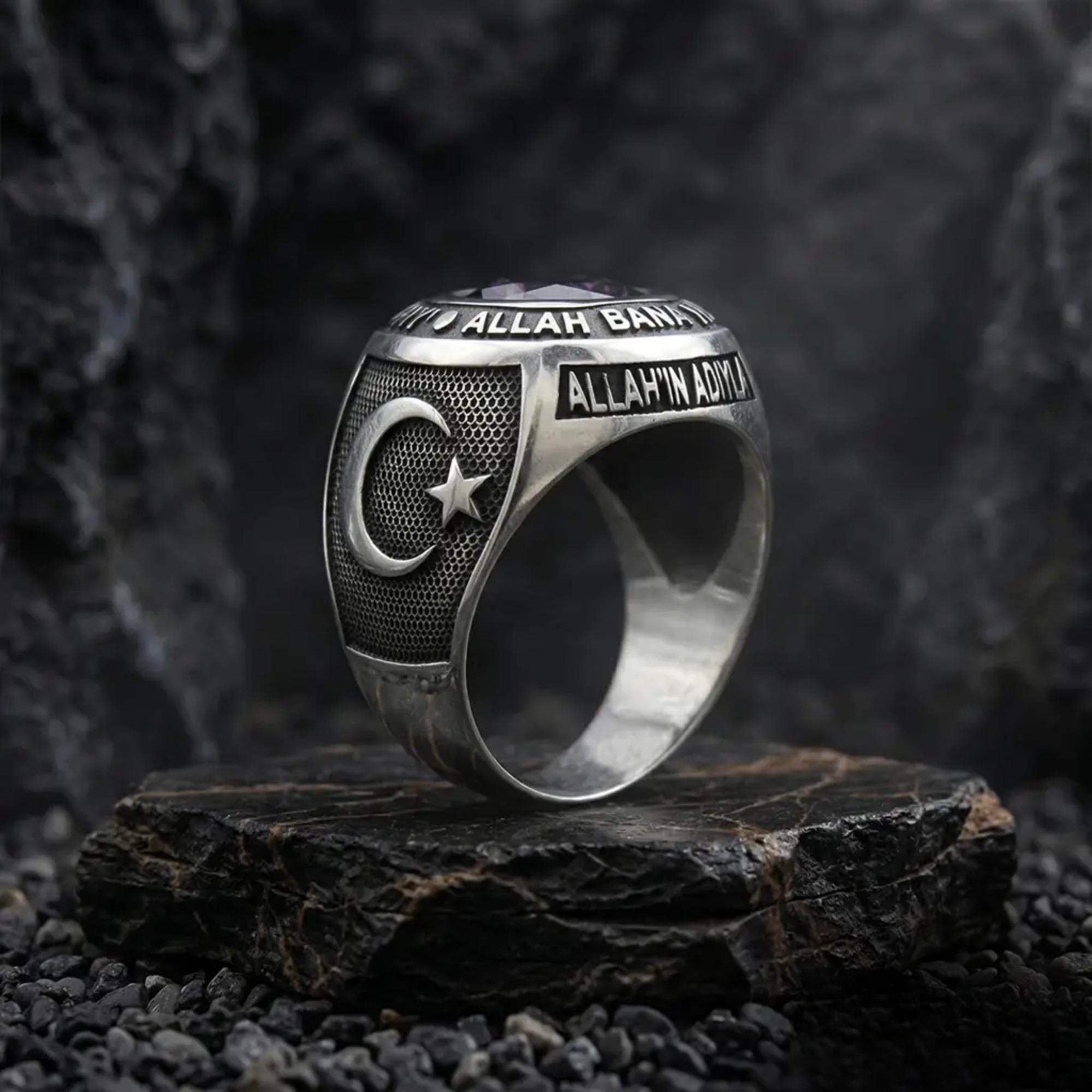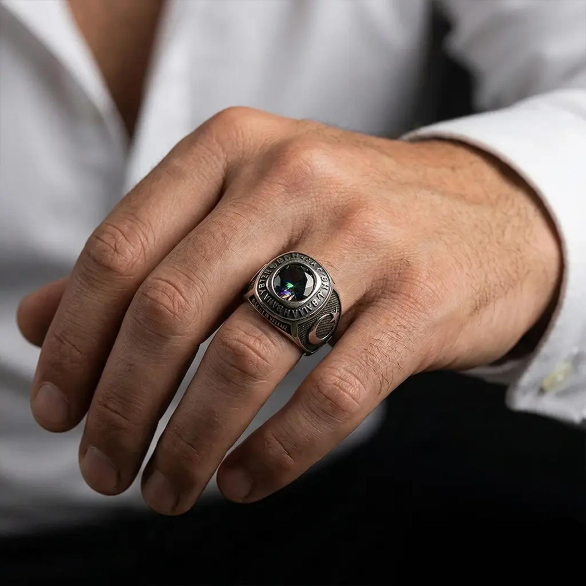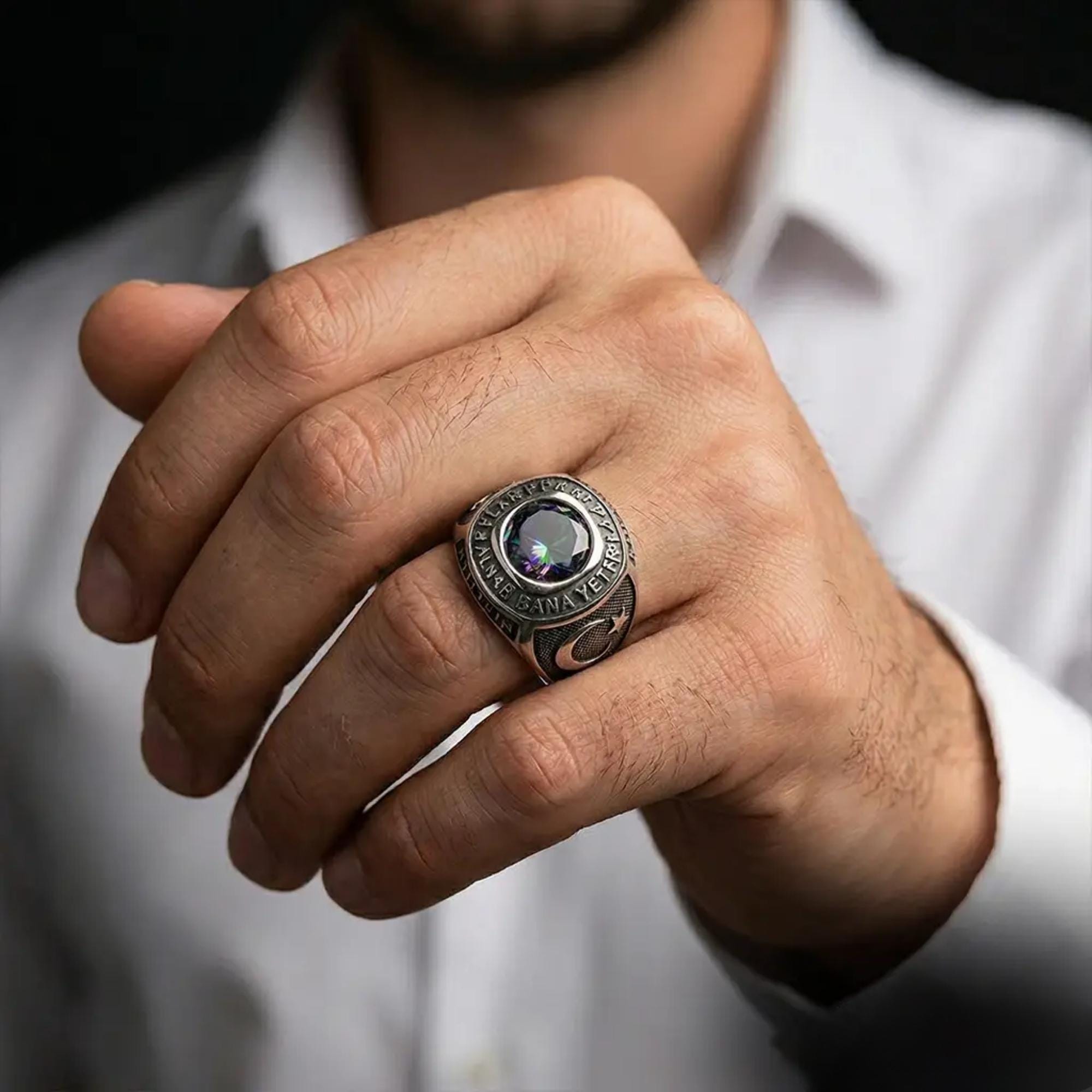 This striking 925 sterling silver men’s ring combines the mesmerizing glow of mystic topaz with the powerful phrase “Allah Bana Yeter” (“Allah is Sufficient for Me”), creating a piece that feels both deeply spiritual and undeniably bold. Enhanced with national symbols and heritage-inspired details, this ring is designed for men who want their jewelry to express character, conviction, and identity.