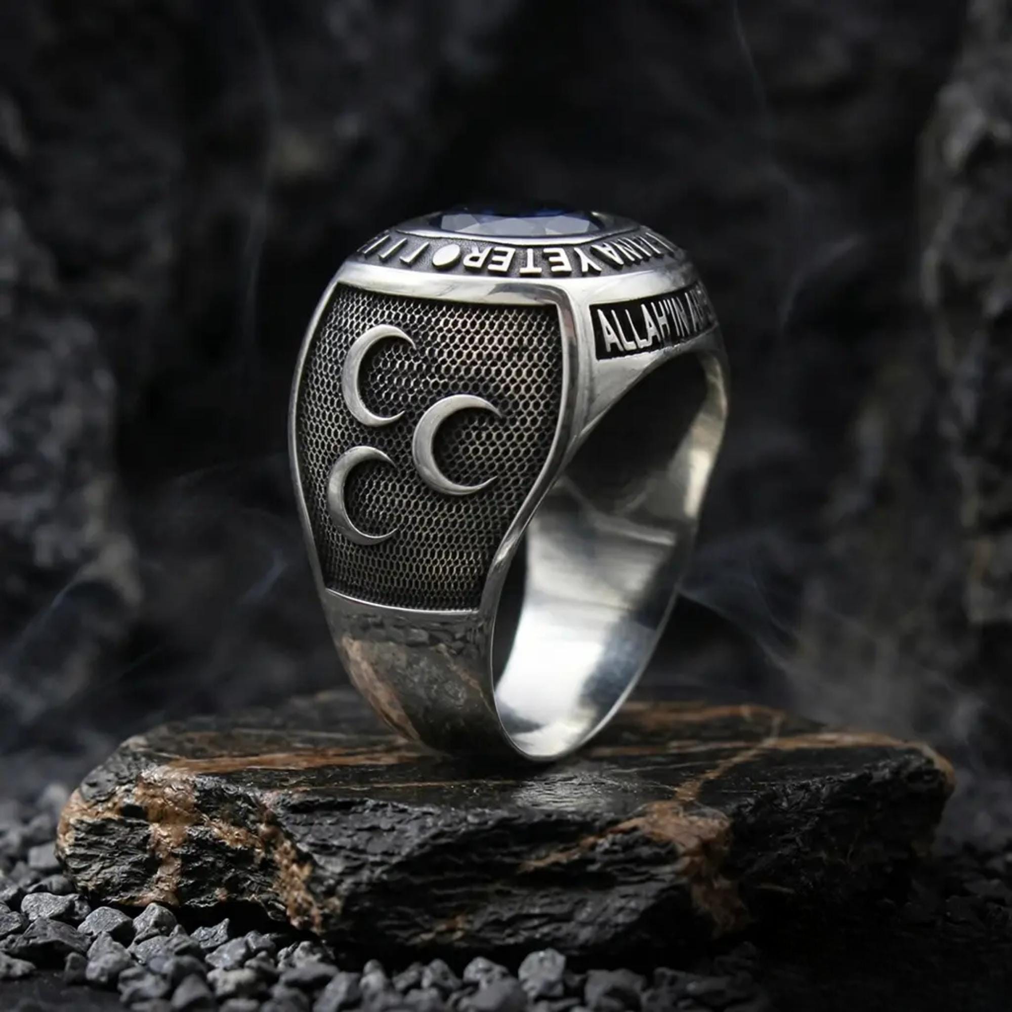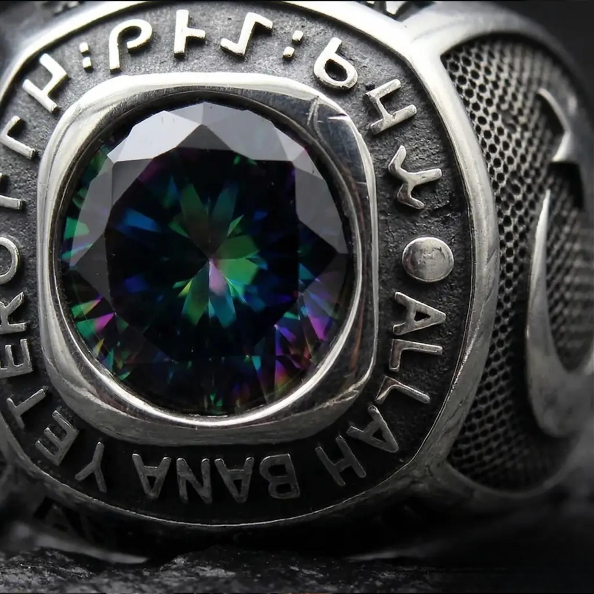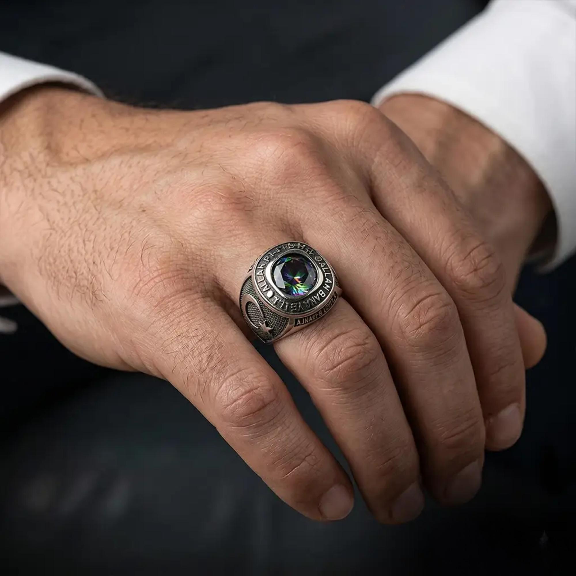 This striking 925 sterling silver men’s ring combines the mesmerizing glow of mystic topaz with the powerful phrase “Allah Bana Yeter” (“Allah is Sufficient for Me”), creating a piece that feels both deeply spiritual and undeniably bold. Enhanced with national symbols and heritage-inspired details, this ring is designed for men who want their jewelry to express character, conviction, and identity.