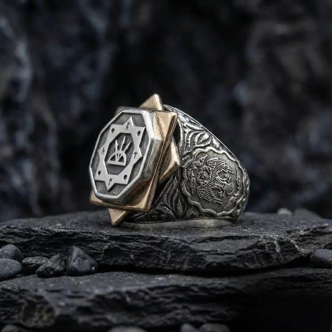 This striking handcrafted ring features the Seljuk Coat of Arms with the Double-Headed Eagle on one side, the Ottoman Flag motif on the other, and the Seal of Oghuz Kagan prominently displayed on the top. Every detail is created to reflect heritage, strength, leadership, and identity.
