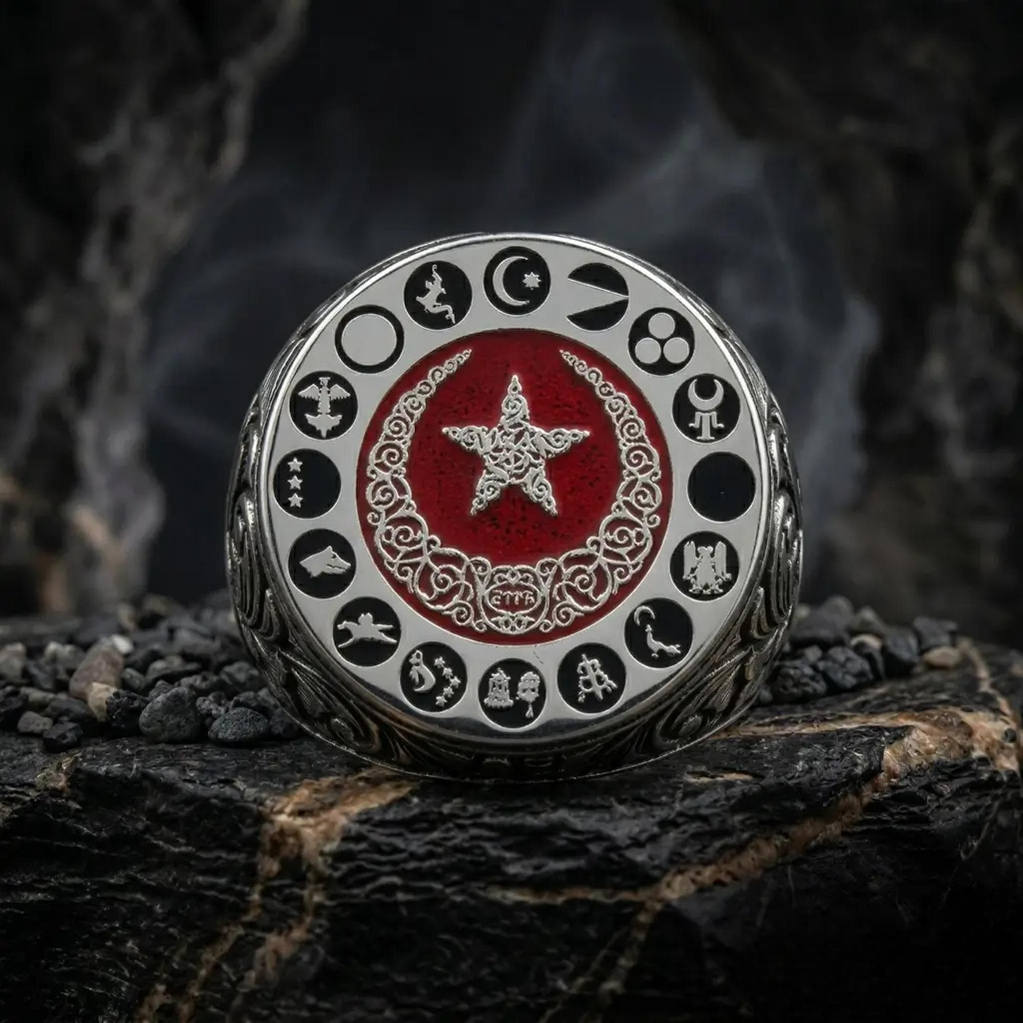 This striking 925 sterling silver ring is designed with the symbol of the 16 Great Turkish States and a powerful central crescent and star engraving, representing heritage, strength, pride, and timeless identity.