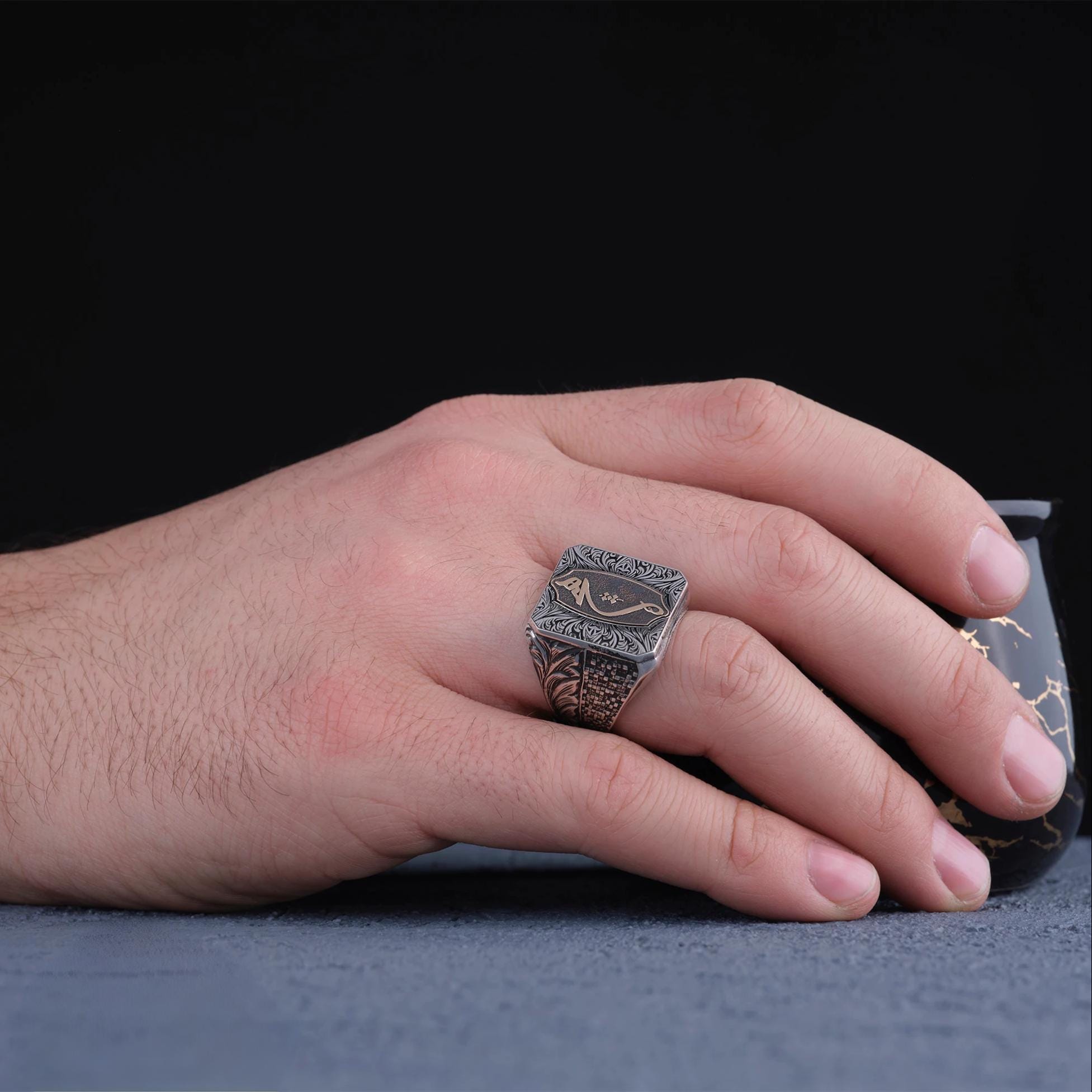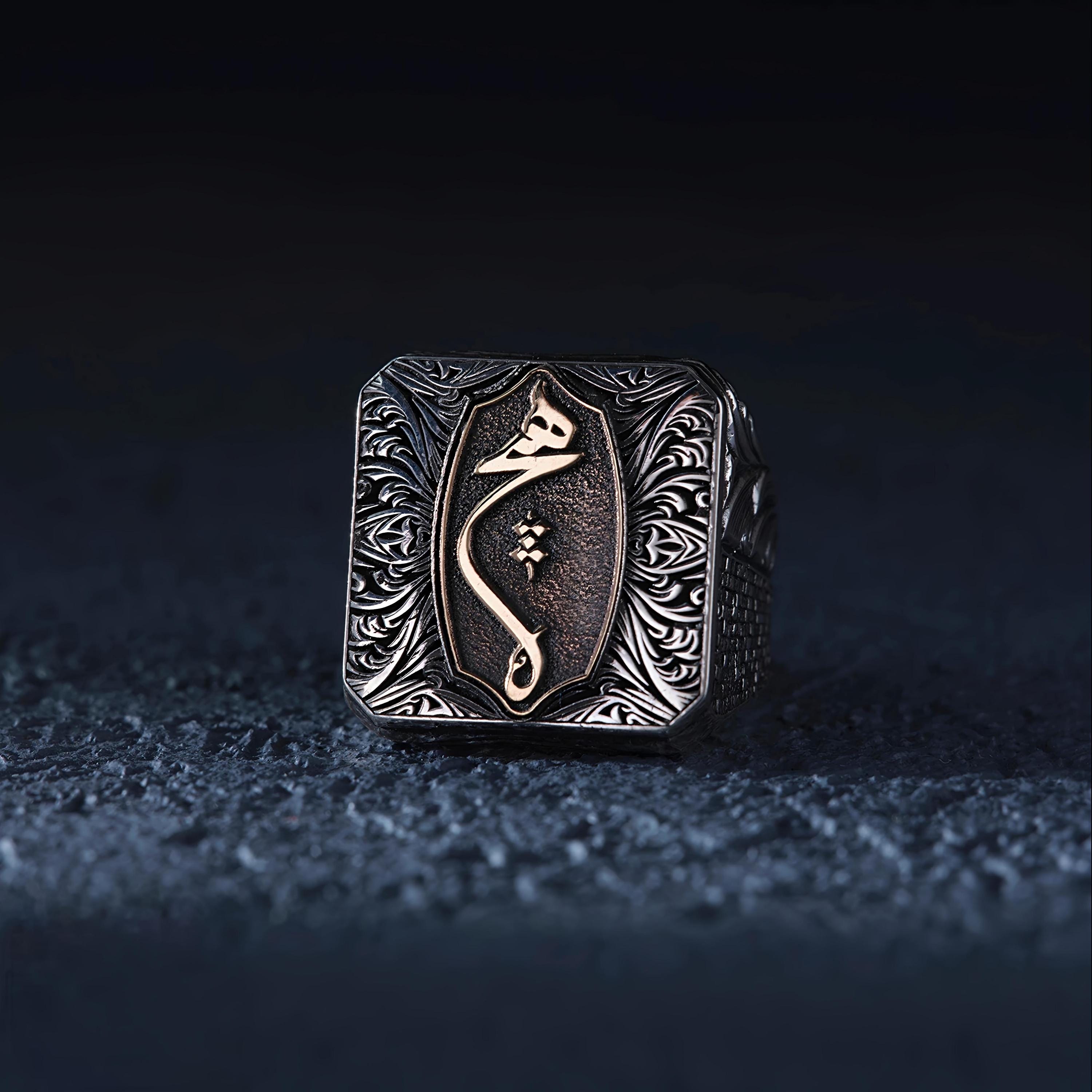 One side features a stone wall pattern, while the other side is decorated with hand-engraved kalemkar motifs. The top part is enriched with fine engraved ornamentation, and the center showcases a vertical Hich motif, giving the ring a deep and symbolic character.