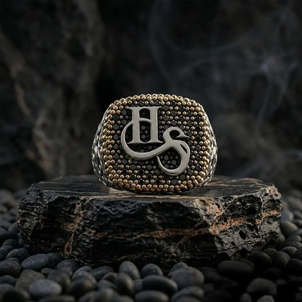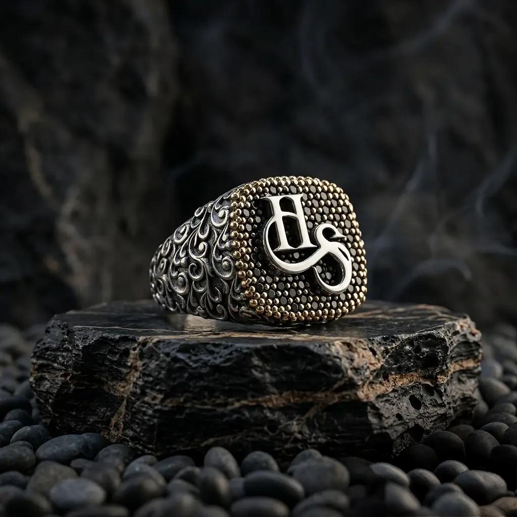 Designed with custom letter detailing, enriched by black zircon stones, and finished with elegant side engravings, this ring captures strength, prestige, and individuality in one refined piece.